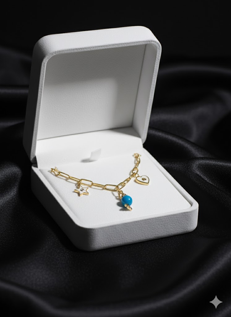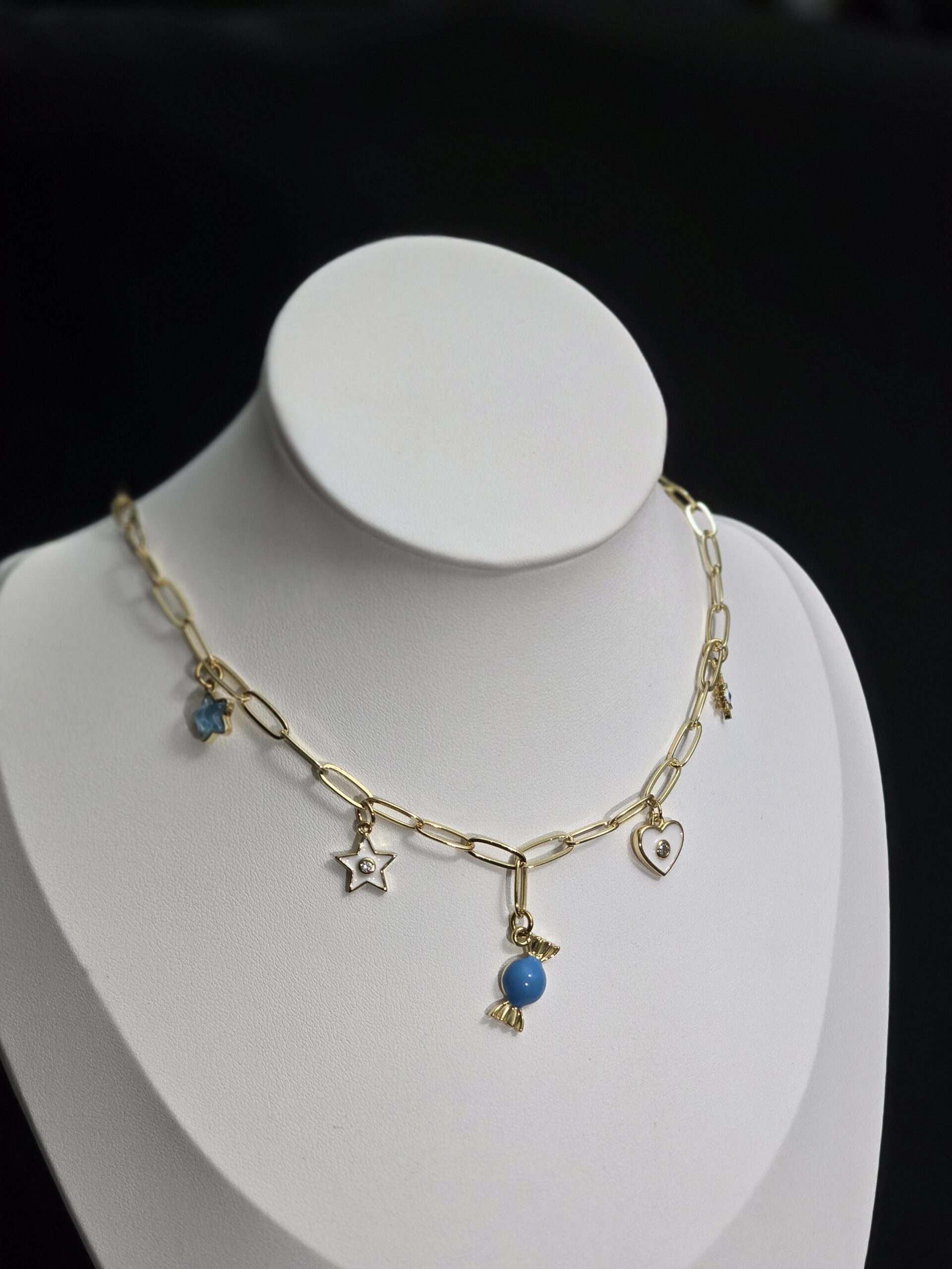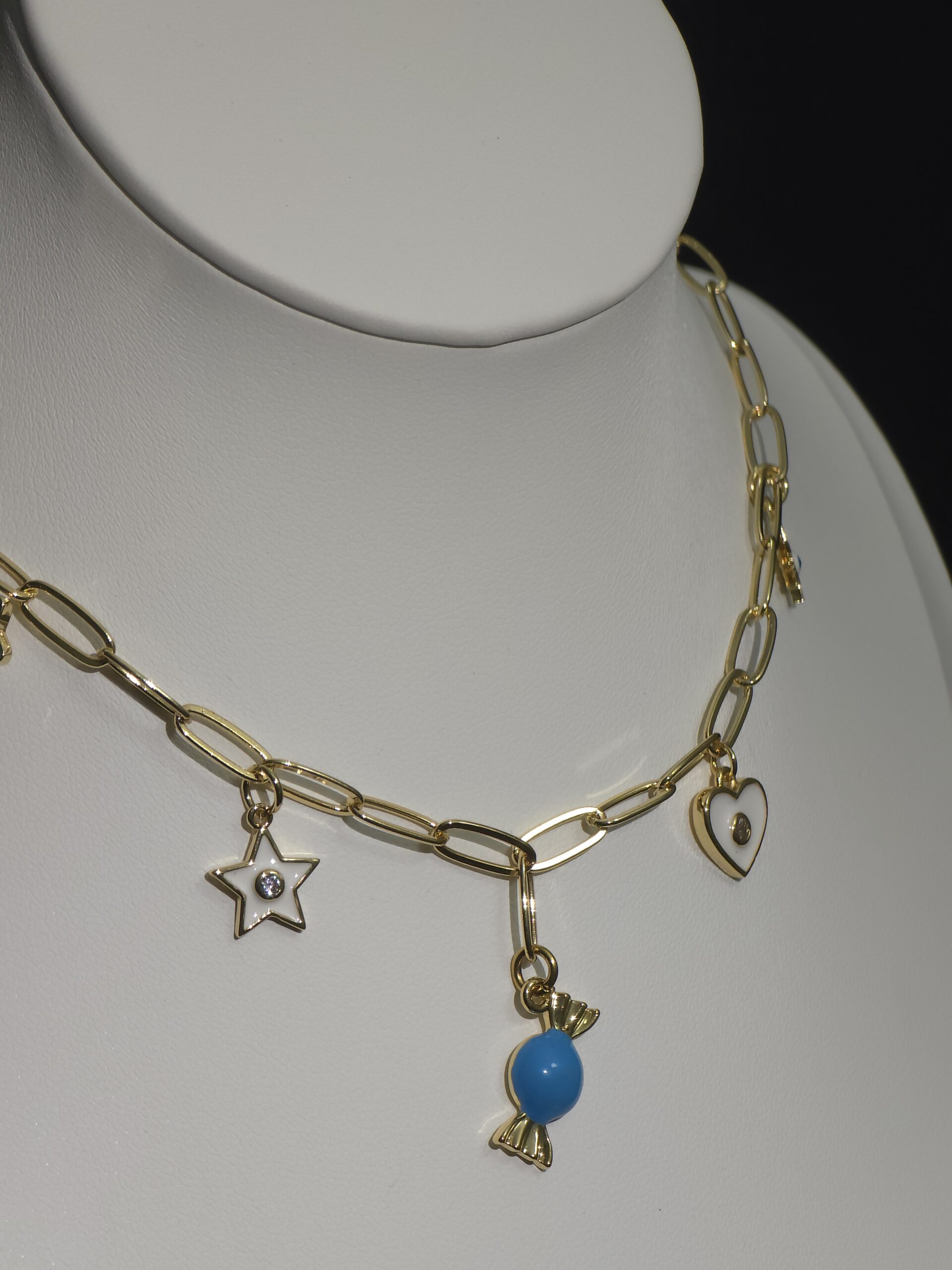 Este divertido y encantador collar dorado destaca por su estilo moderno y juvenil. Su cadena de eslabones grandes le da un toque contemporáneo, mientras que sus dijes aportan color y personalidad: una estrella, un corazón y un caramelo azul, símbolos de alegría, dulzura y amor.