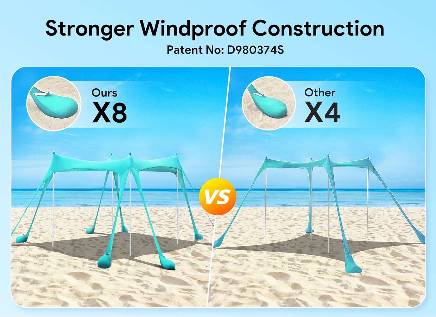 Sombra amplia para familia y amigos. Superficie de cobertura aprox. 3×3 m y postes de hasta ~2 m de alto (según tensión y terreno). Tela lycra con protección UPF50+, 8 sacos de arena, 4 postes de aluminio, estacas y palitas. Se arma en ≈5 minutos y queda muy estable en arena o pasto. Ideal para playa, camping o picnic.