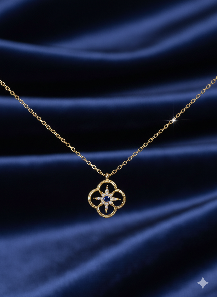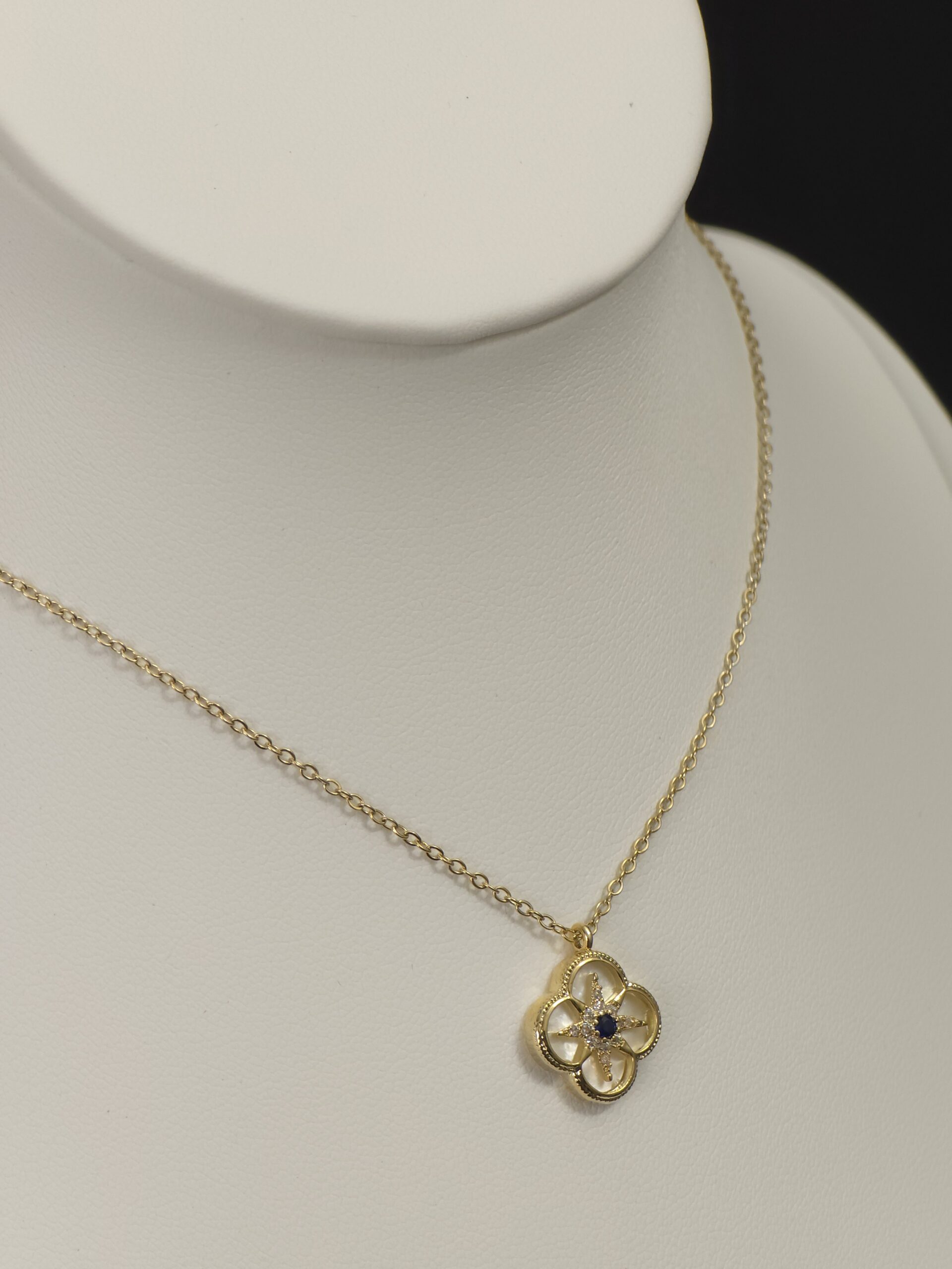 Este elegante collar presenta un diseño sofisticado y atemporal, ideal para realzar cualquier atuendo. Su colgante en forma de flor estilizada combina líneas curvas y simétricas, elaboradas en un delicado baño de oro que resalta su brillo natural. En el centro, una pequeña gema azul aporta un toque de color y distinción, rodeada por incrustaciones de finos cristales que añaden luminosidad y elegancia.