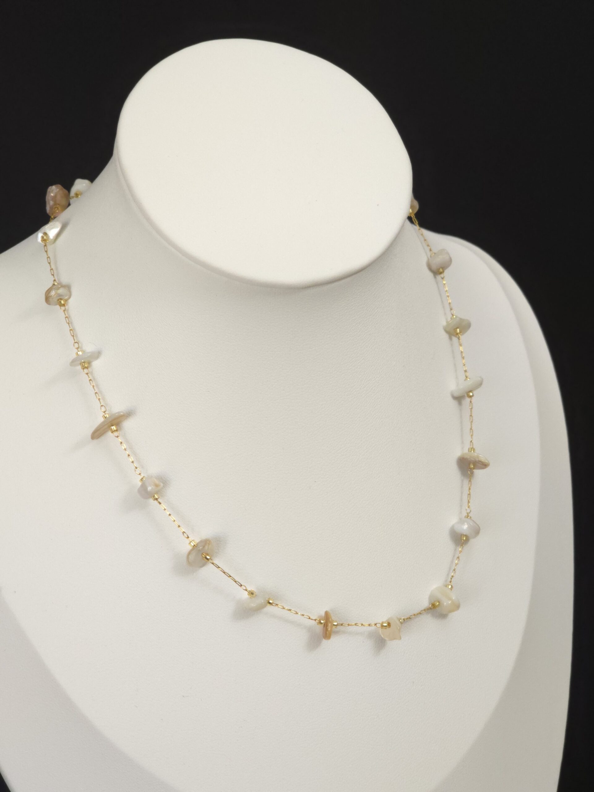 Este delicado collar combina la sutileza del diseño minimalista con la belleza natural de las perlas irregulares. Cada cuenta, cuidadosamente seleccionada, aporta un brillo único y orgánico que resalta sobre la fina cadena dorada, creando una pieza elegante, versátil y con un encanto artesanal.
