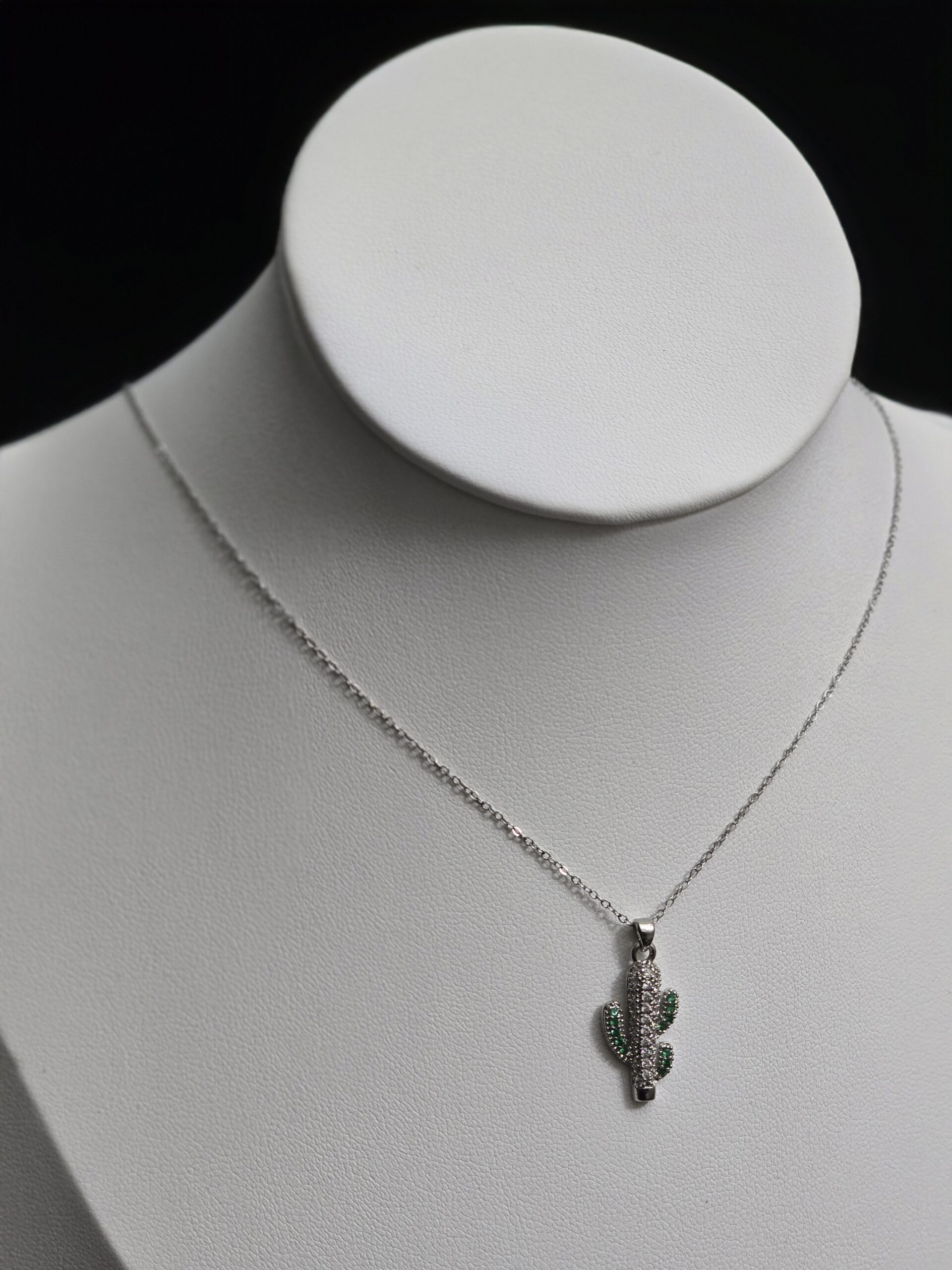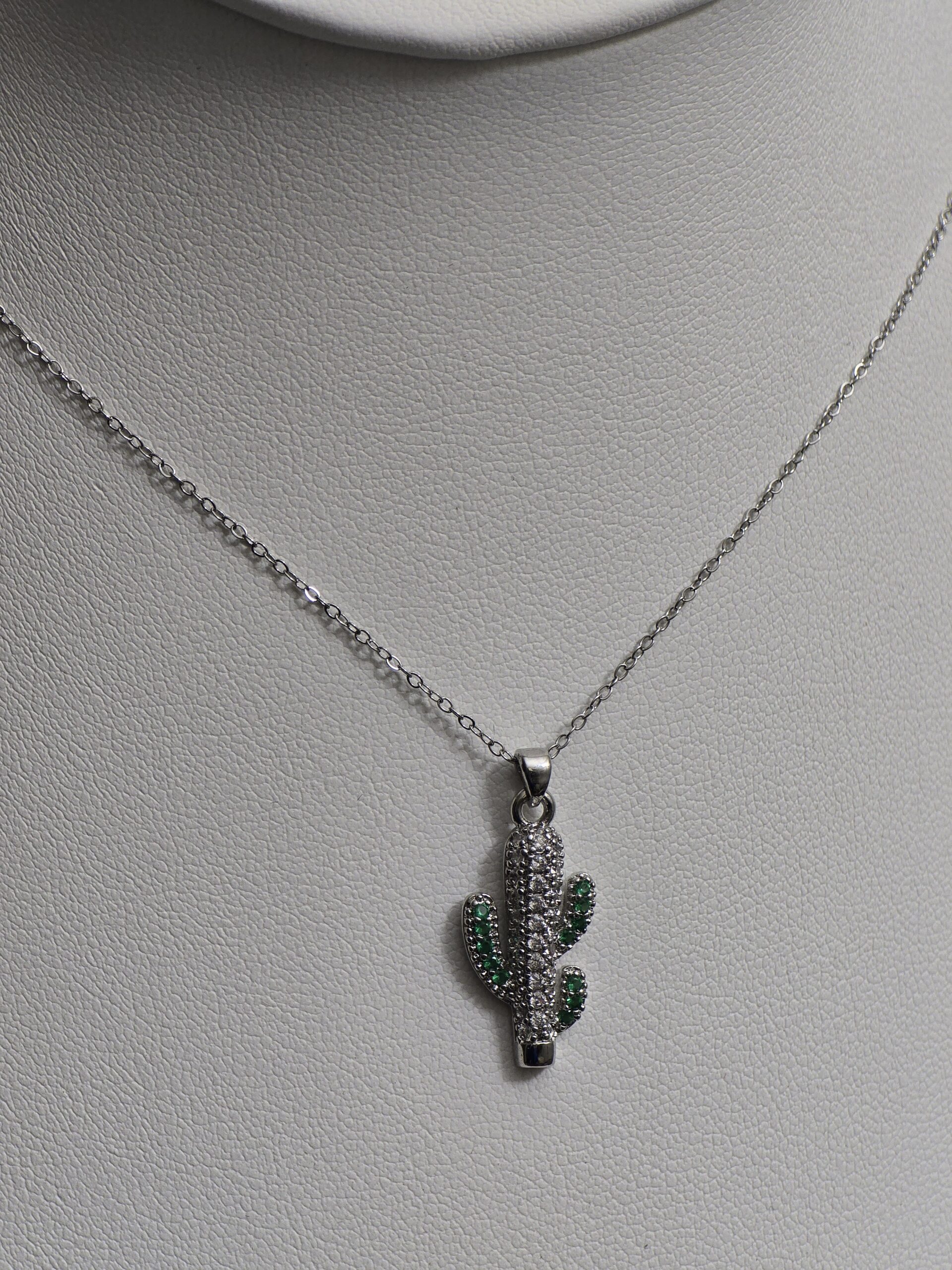 Este moderno collar en tono plateado destaca por su original dije en forma de cactus, símbolo de fortaleza, resiliencia y energía positiva. El colgante está decorado con pequeñas incrustaciones brillantes en tonos verdes y blancos, que aportan un contraste encantador y reflejan la luz con elegancia.