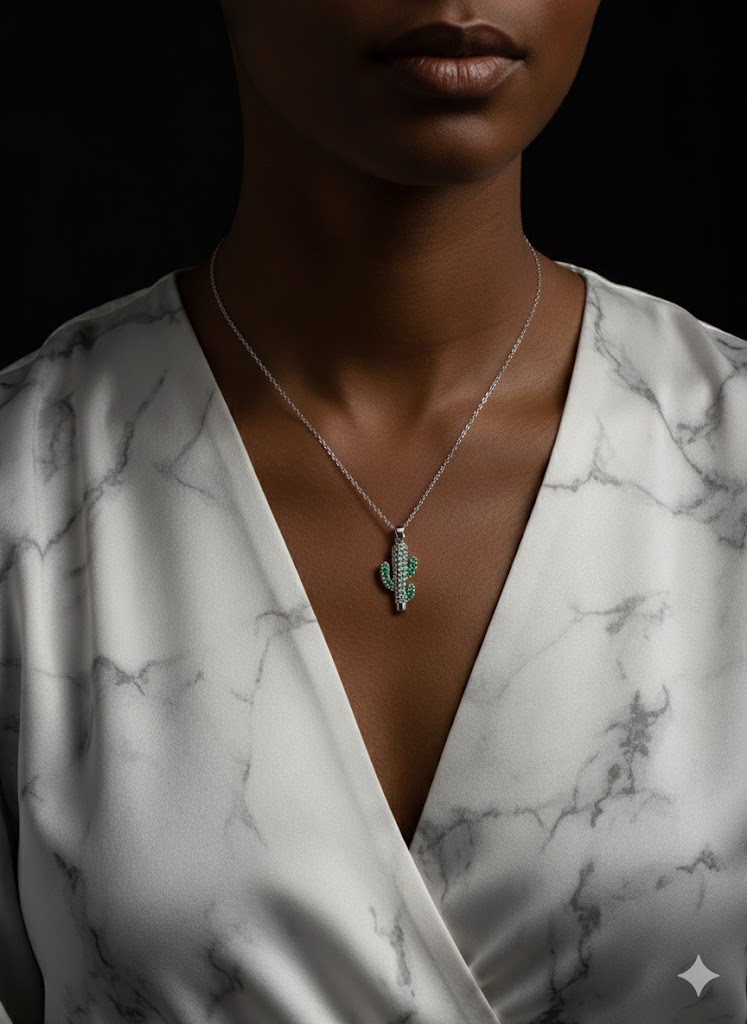 La cadena fina realza el protagonismo del cactus, convirtiéndolo en una pieza ideal para quienes aman los diseños únicos y con personalidad. Perfecto para añadir un toque divertido y sofisticado a cualquier look, tanto casual como chic.