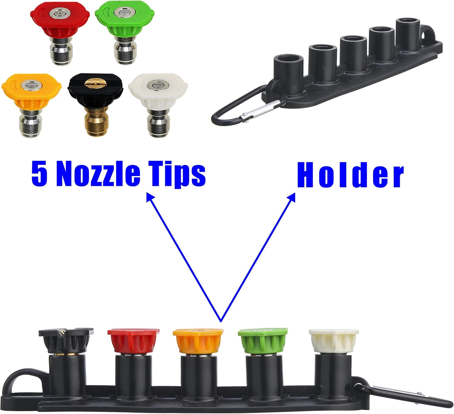 5 puntas de boquilla de pulverización: tienen diferentes ángulos de pulverización (0, 15, 25, 40, 65 grados). Elija diferentes boquillas según sus necesidades. Como regar flores y plantas, lavar el automóvil. La presión máxima es de hasta 4000 PSI. Y se proporciona un soporte de boquilla en el paquete.